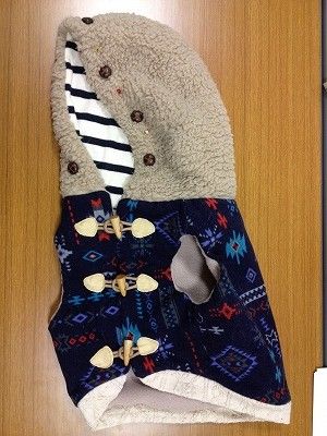 エスニックな身頃の生地に合わせてフードにも飾りを縫い付けています。