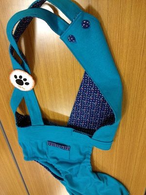 大きい! 胸当てはボタンホールを作って、裏地の生地で作ったくるみボタンをつけています。
