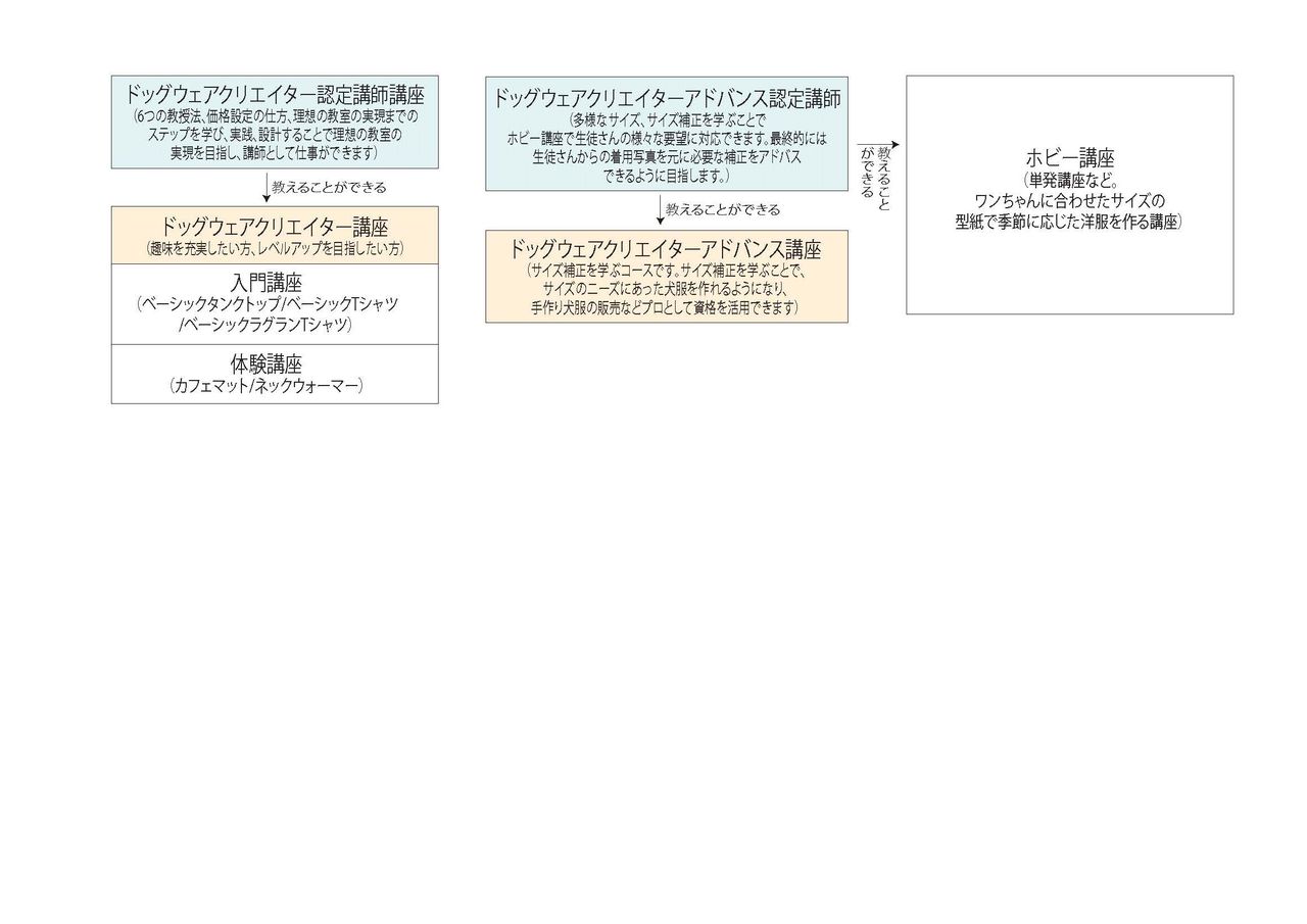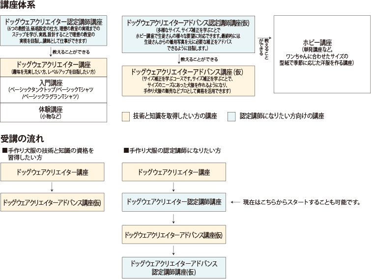 この講座では、主に下のオレンジ部分、「ドッグウェアクリエイター講座」を開催するべく、