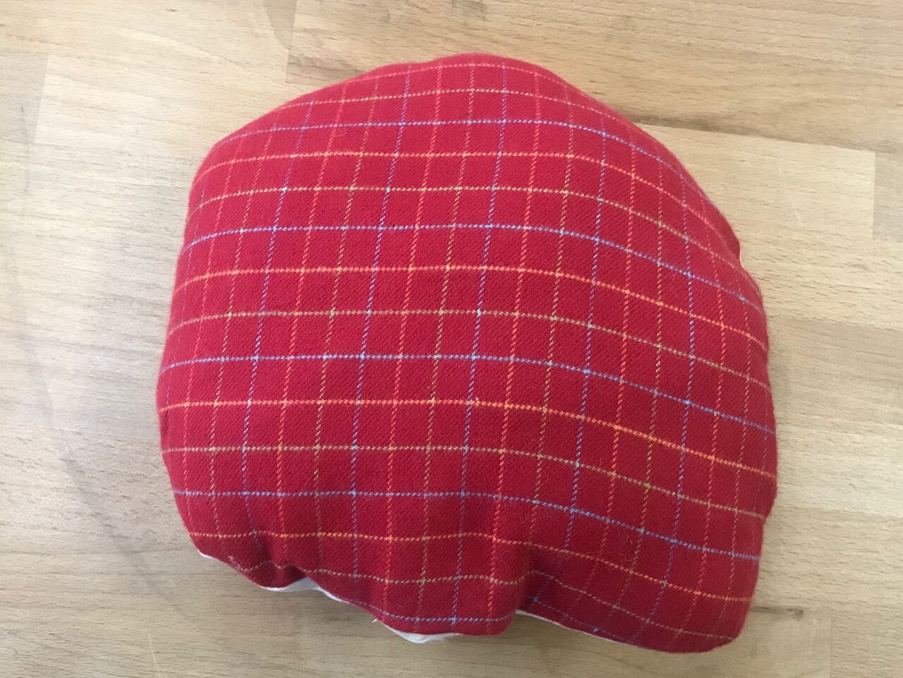 アレンジ1:写真のハットと同じ生地をクッション裏地に使用。